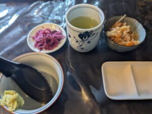 注文すると間もなく、お茶と小鉢2品が提供されます。