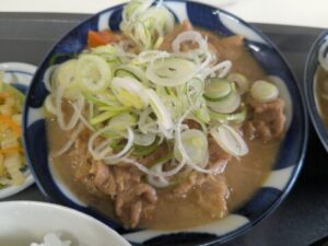 味噌にはネギがたくさん、カレーには福神漬けが添えられています。