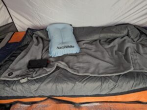 冬キャンプで気温が0℃を下回るとやはり寒いので、最近はモバイルバッテリーで使える電気ブランケットを中に敷いて使っています。